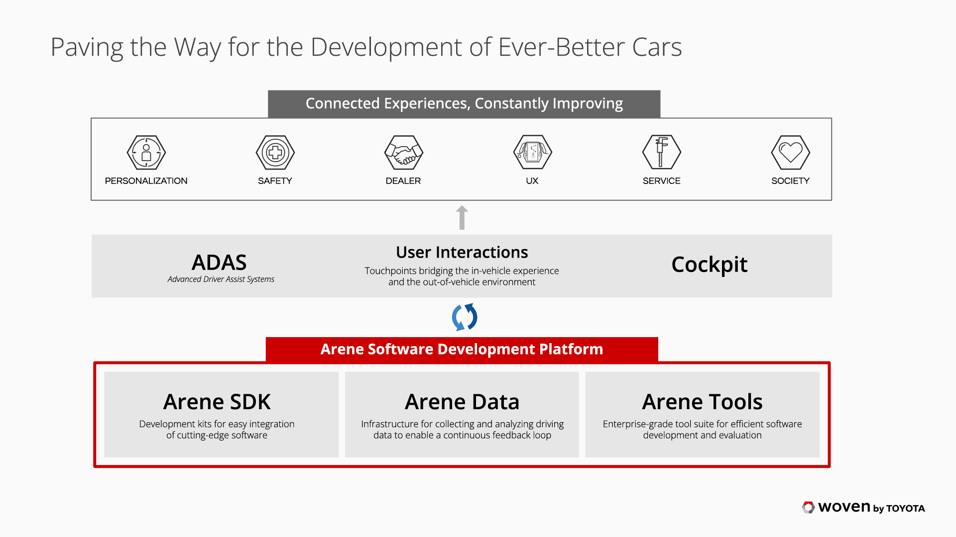 Woven by Toyota, a part of the Toyota Group, is challenging the current state of mobility through human-centric innovation and empowering mobility transformation. Through our AD/ADAS technology, our software development platform Arene, our mobility test course Toyota Woven City, and Toyota’s growth fund, Woven Capital, we are pioneering the movement of people, goods, information, and energy, weaving a future of enhanced safety, connectivity and well-being for all.