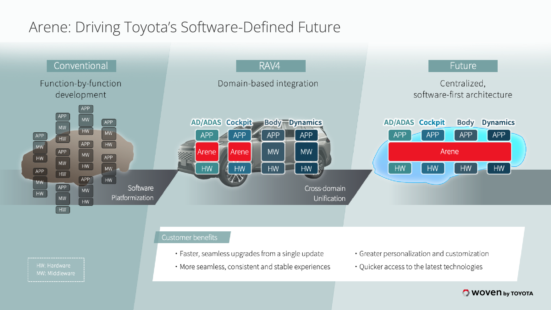 Arene, through its SDK, Data, and Tools packages, connects the in-vehicle experience with the out-of-vehicle environment and enables the development and delivery of ever-better cars. The Arene SDK and Arene Tools help shorten development times, and together with Arene Data, they accelerate the delivery of new and improved features even after the vehicle leaves the factory floor. This results in a driving experience that becomes more personalized, more adaptive, and continuously refined over time. As one of Toyota’s most popular models worldwide, the all-new RAV4, with Arene, is a launchpad for continuous global innovation delivering “best-in-town” mobility experiences, and marks the first step toward fully software-defined Toyota vehicles, as envisioned by WbyT: beloved, human-centered vehicles that grow together with their customers.