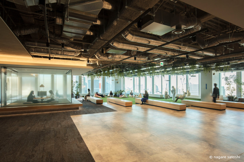 プラザ:眺めの良い景色と人工芝に囲まれたスペースでは、仕事から離れてハンモックやクッションにもたれながら考えることで、仕事に活かせる発想を得ることができます。