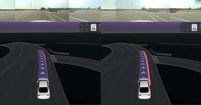 当社の初期モデル(BEFORE)は内側車線境界を越えて道路を離れます。より多くの曲がりデータを追加した結果、車は車線の中心にとどまるようになりました(AFTER)。