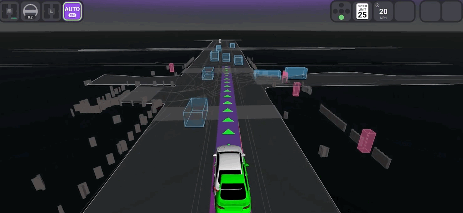 MLプランナーは前方に割り込みがあった場面に反応しています。緑色の車両は実際の道路上での車両の挙動を示し、白色の車両は当社のMLプランナーがシミュレーションで反応した挙動を示しています。