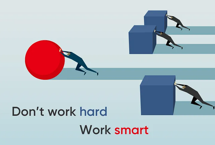 「一生懸命働くのではなく、賢く働こう」を表現した、他人がそれぞれ大きな立方体を押している中で大きな球体を押している男性のイラスト