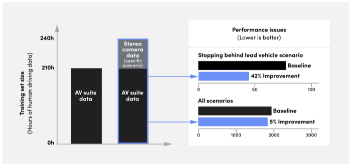We needed to prove the hypothesis that lower-fidelity camera data could be used for training our ML Planner as effectively as the high-quality data gathered by our AV sensor suite. We began by picking a fairly common scenario — stopping behind a lead vehicle — to see if we could improve its performance with low-cost data from stereo cameras. Previously, we only used data from AV sensor suites to train the ML Planner on this scenario. We mined our camera data to find examples of this scenario type, and added them to the AV data training set.
