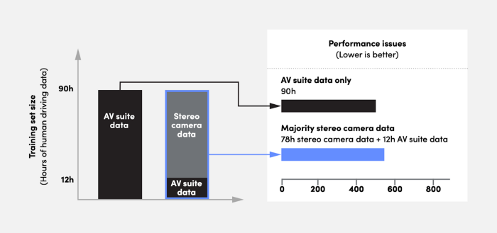 Last year, we took a critical step in delivering on Autonomy 2.0 by using an ML model to power our motion planner, the core decision-making module of our self-driving system. We saw the ML Planner’s performance improve as we trained it on more human driving data. However, at the time we were collecting the driving data using traditional, expensive autonomous vehicle (AV) sensor suites (including lidar and radar).
