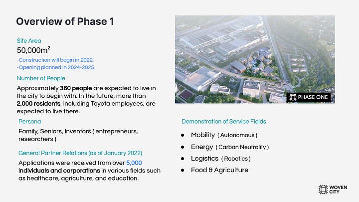 With these residents as its first users, the city will test a total of 12 areas of technology and services, including mobility (automated driving), energy (carbon neutral), logistics (robotics), food and agriculture, which will all be embodied in the lifestyle of Woven City.