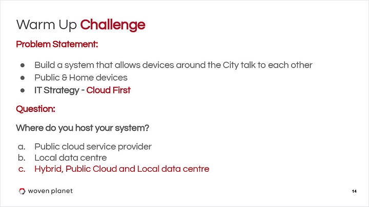 The audience was split between A and B. There is a possibility that Woven City chose the third option, a hybrid of public cloud and local data centers. Shum explained that following the company’s strategy of Cloud First is only the beginning and is merely “doing your job.” The architectural decision should take into account things such as non-functional requirements, application latency, high availability, and disaster recovery.