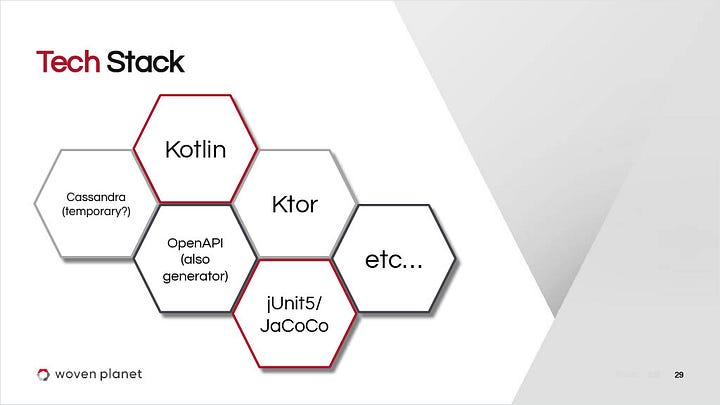 While the Payment Solution Team uses Kotlin for the backend, each team at Woven City utilizes a language that they are more familiar and efficient with. Popular languages within the city are Golang, Java, and Kotlin, with some use of Node and Rust as well.