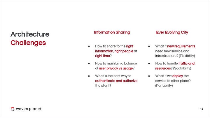 Shum laid out specific challenges they face for Woven City’s architectural design, “How do we share the right information, with the right people, at the right time? How do we balance user privacy and data usage? How do we do authentication and authorization when so many people use so many applications?”